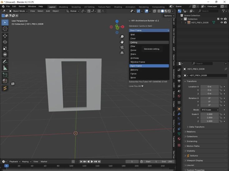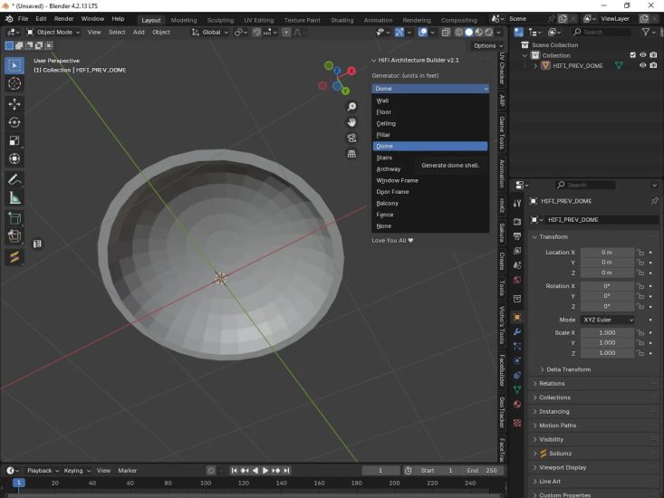ℹ️ 适用于Blender的模块化建筑生成器。只需点击鼠标,即可快速创建墙壁、地板、天花板、柱子、穹顶、楼梯、拱门、窗框和门框、阳台等结构。该插件支持实时预览、生成前编辑对象、清理工具和快速导出。