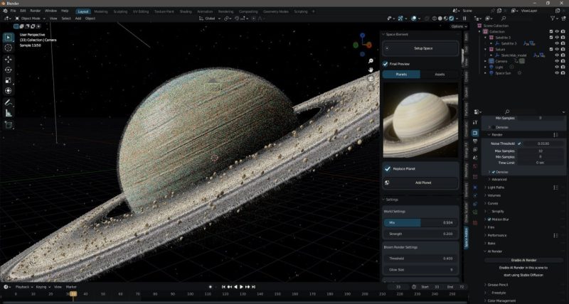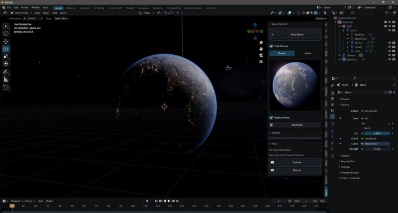 ℹ️ 此为Blender插件,通过简单点击鼠标和调整设置即可轻松创建太空场景。它会自动调整合适的灯光和天空效果,并提供可添加和使用的真实地球及其他行星模型。套件还包含可用于场景的资源。可免费分发并用于任何目的和场景。